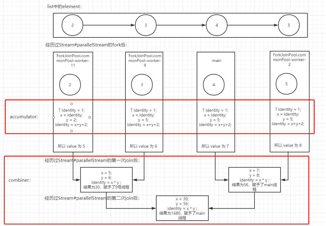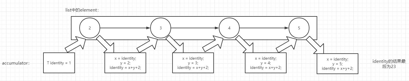 此方法比较好理解,归约的过程即对于传入的 identity,将 Stream 流中的每个元素执行传入的累加器 accumulator 中的操作后赋予 identity。